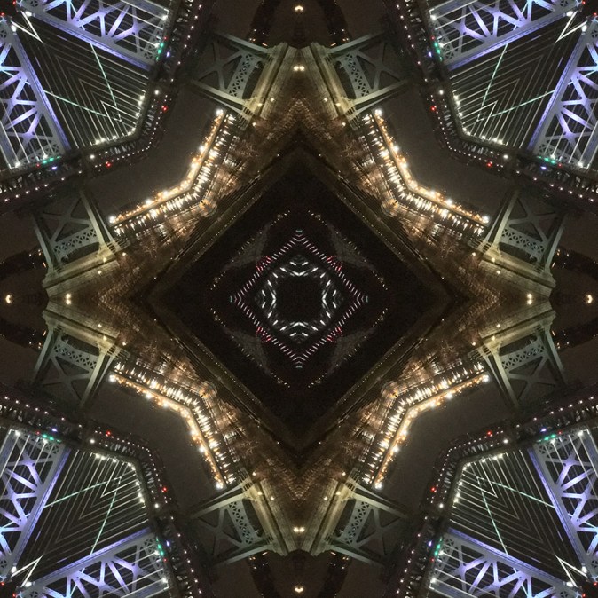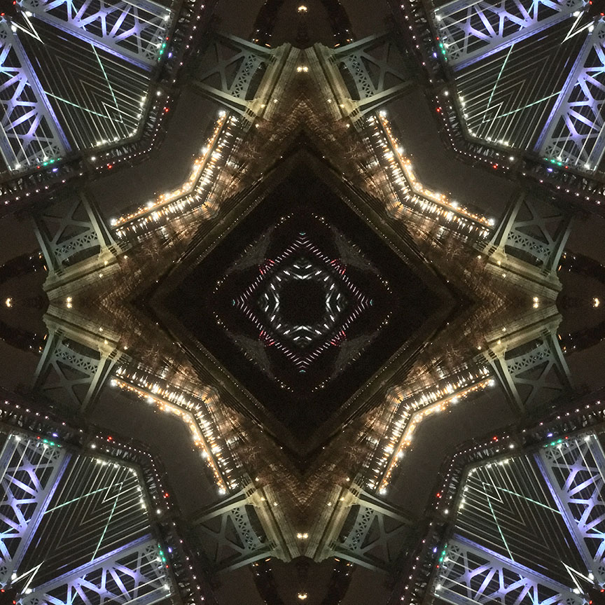Below is the original photo used to create this image. It’s of the Benjamin Franklin Bridge in Philadelphia, Pennsylvania, taken from my hotel window in December, 2017 while visiting family before Christmas. No special lighting or effects, just a snap from my smart phone.
