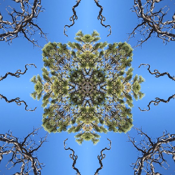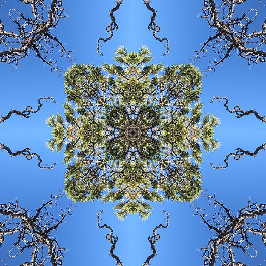 Below is the original photo used to create this image. This was taken at the Grand Canyon during a morning hike along the southern rim on the Greenway Trail. I’m still fascinated by the stark beauty of this dead tree, juxtaposed against the vibrant green of the pine and the watercolor sky. No special lighting or retouching, just a snap from my smart phone.