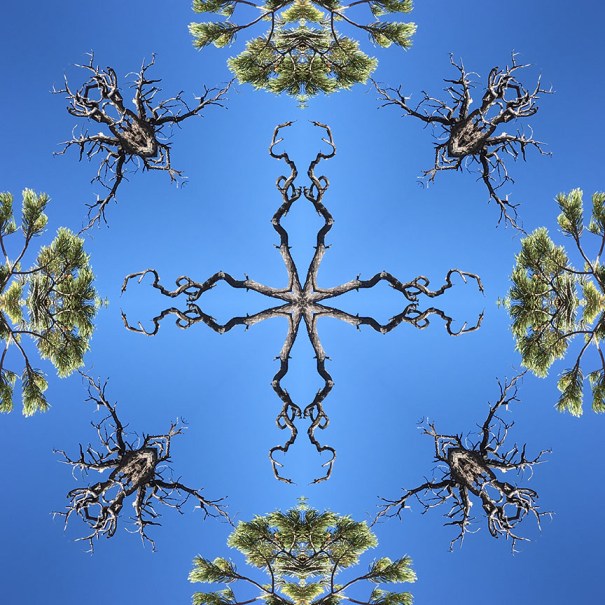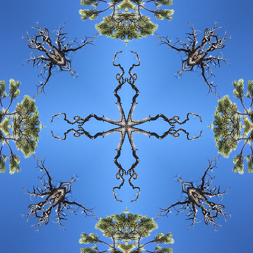 Below is the original photo used to create this image. This was taken at the Grand Canyon during a morning hike along the southern rim on the Greenway Trail. I’m still fascinated by the stark beauty of this dead tree, juxtaposed against the vibrant green of the pine and the watercolor sky. No special lighting or retouching, just a snap from my smart phone.