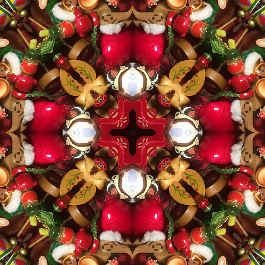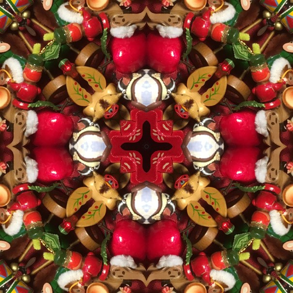 Below is the original photo used to create this image. It’s a gathering of kitschy vintage ornaments from my holiday stash. No special lighting or effects, just a snap from my smartphone.