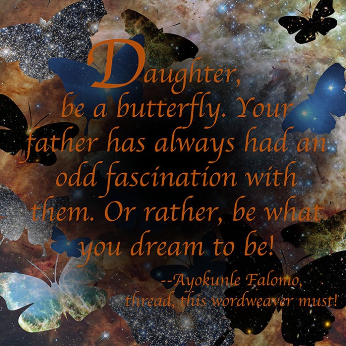 Daughter, be a butterfly. Your father has always had an odd fascination with them. Or rather, be what you dream to be!