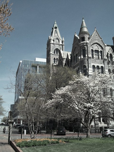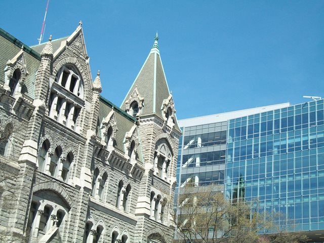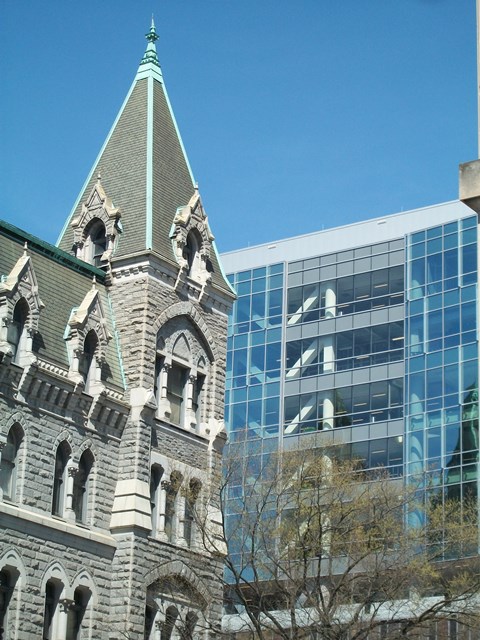 My favorite example of this is the Old City Hall building. It’s High Victorian Gothic design contrasts beautifully with the modern glass buildings surrounding it.