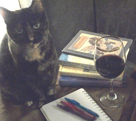 Since taking a photo of my physical home is not an option, I decided to snap a pic of the things that bring me comfort. I had wanted to show a cup of tea or cocoa, but all my mugs are already moved. I had enough forethought to keep a few bottles of wine here. Thankfully, one of my cats (Birdie) decided she needed to get in on the action and added the warmth needed.