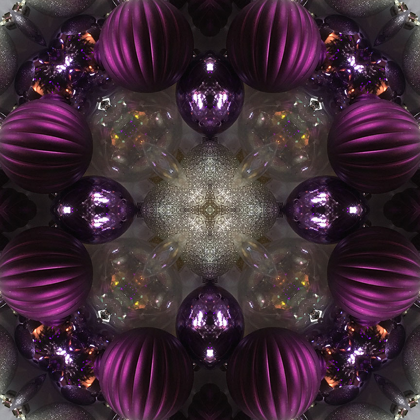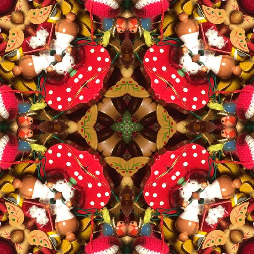 Below is the original photo used to create this image. It’s a gathering of kitschy vintage ornaments from my holiday stash. No special lighting or effects, just a snap from my smartphone.