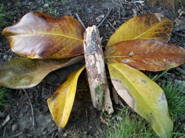 I met up with my workout buddy after work and we walked from 2nd & Franklin to Monroe Park. Once there, I found some lovely Magnolia leaves and other tree debris and put together this rustic, au-naturale, butterfly.